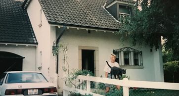 A better view of our house in Geneva is this painting by our neighbor Rolf whose wife loved Foggy as much as we did and was Peg's primary source of developing her french over the 4 years living there.